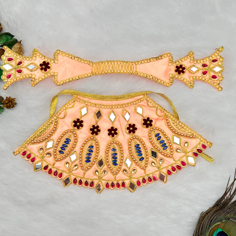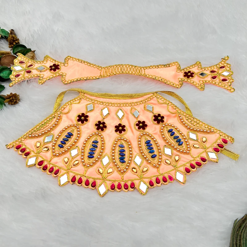 Description- Enhance your deity’s divine presence with these beautiful Lahnga Patka Poshak, specially designed for Mata Rani, Lakkshmi Mata and Khatu Shyam. The detailed craftsmanship and premium materials ensure the poshak maintains its beauty through regular use. Designed to fit comfortably to your Idols, ensuring a perfect fit. With different colors, you can easily match the Dress with different accessories. Each Dress is crafted by skilled artist, adding a personal touch to your devotional dress and accessories.