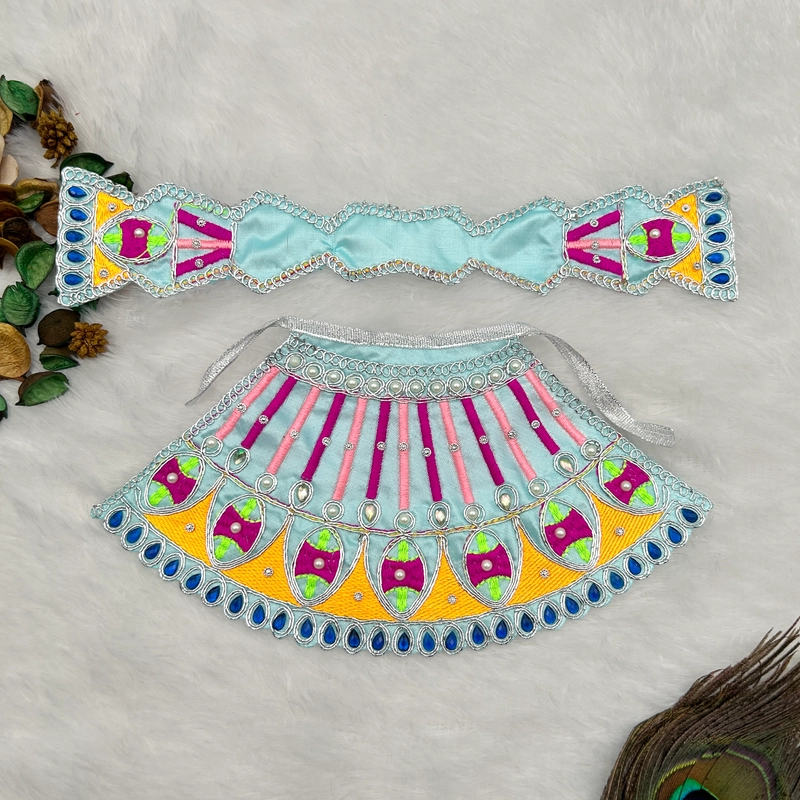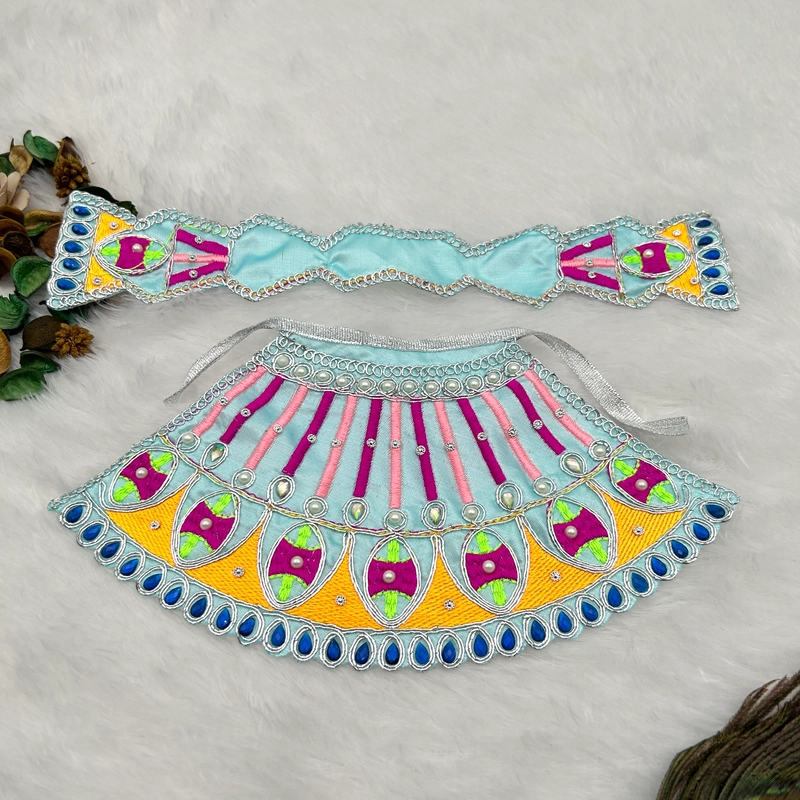 Description- Enhance your deity’s divine presence with these beautiful Lahnga Patka Poshak, specially designed for Mata Rani, Lakkshmi Mata and Khatu Shyam. The detailed craftsmanship and premium materials ensure the poshak maintains its beauty through regular use. Designed to fit comfortably to your Idols, ensuring a perfect fit. With different colors, you can easily match the Dress with different accessories. Each Dress is crafted by skilled artist, adding a personal touch to your devotional dress and accessories.