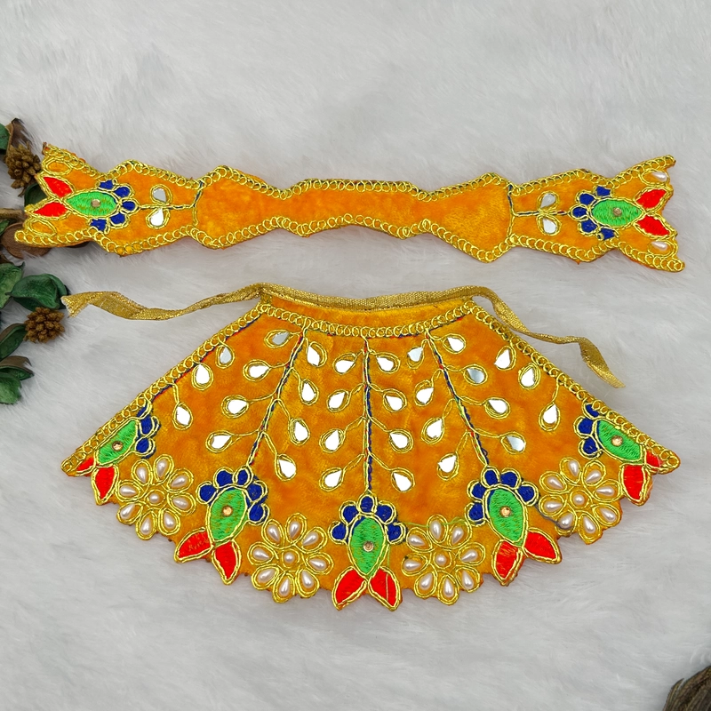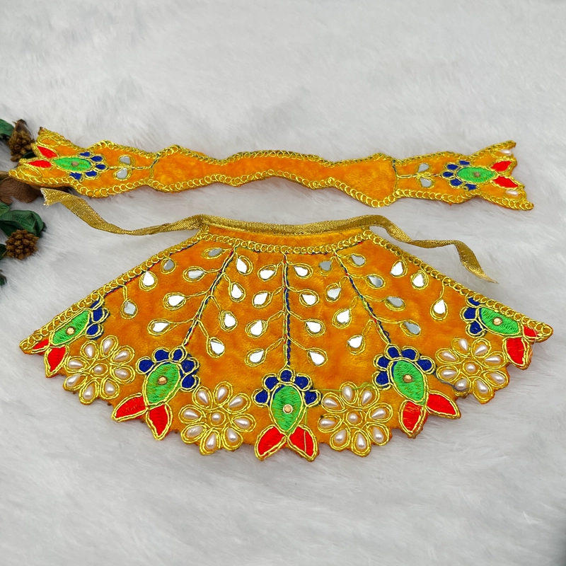 Description- Enhance your deity’s divine presence with these beautiful Lahnga Patka Poshak, specially designed for Mata Rani, Lakkshmi Mata and Khatu Shyam. The detailed craftsmanship and premium materials ensure the poshak maintains its beauty through regular use. Designed to fit comfortably to your Idols, ensuring a perfect fit. With different colors, you can easily match the Dress with different accessories. Each Dress is crafted by skilled artist, adding a personal touch to your devotional dress and accessories.